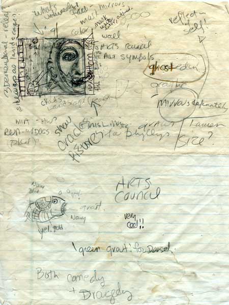 The reflection component is very important to the collaborative creative process and can be accomplished through exhibits. The first reception took place December 16, 2003 directly following the completion of the mosaic. A second, formal reception was held at the Saratoga County Arts Council (SCAC) where the mosaic is permanently installed. The SCAC artist opening reception was smashingly fun. The student film was a great success as it was featured along side the mosaic. Many interesting people attended the show and all were curious about the moonscape mosaic; the process and its meaning. It was exciting to share space with the New York City artists exhibiting in the gallery that night. BOCES students, Hopper and Renee and friends showed up around 6pm and felt comfortable staying most of the evening. They were like sentries for the mosaic and film, making sure it kept looping properly for the gallery audience. The students were thrilled having so many questions directed to them about moonscape mosaic. Arvilla and Maggie showed up later in the evening and they were elegant. They wore their artist name tags and walked confidently around the main gallery viewing the other artworks. The girls spoke openly with the featured artists Jeff Leonard and Ronn Mattia asking about their artistic process how they made their sculptures and resin paintings. It made my evening. Everyone at the Arts Council was excited to see new, young faces in the gallery. The idea that the artistic process can be shared like this thrills me to the bone. Why hog all the glory?