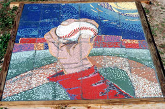 Title: Baseball Mosaic Site:Porters Corners Town Park, Greenfield Year: 1997 Scale: 6x8 Feet Artist: Ceres Zabel Participants: Odyssey Students Sponsors: SPAF 1997 Project Grant